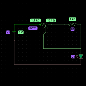 - When the potentiometer is set to a high resistance, less current flows through the LED, making it dim.