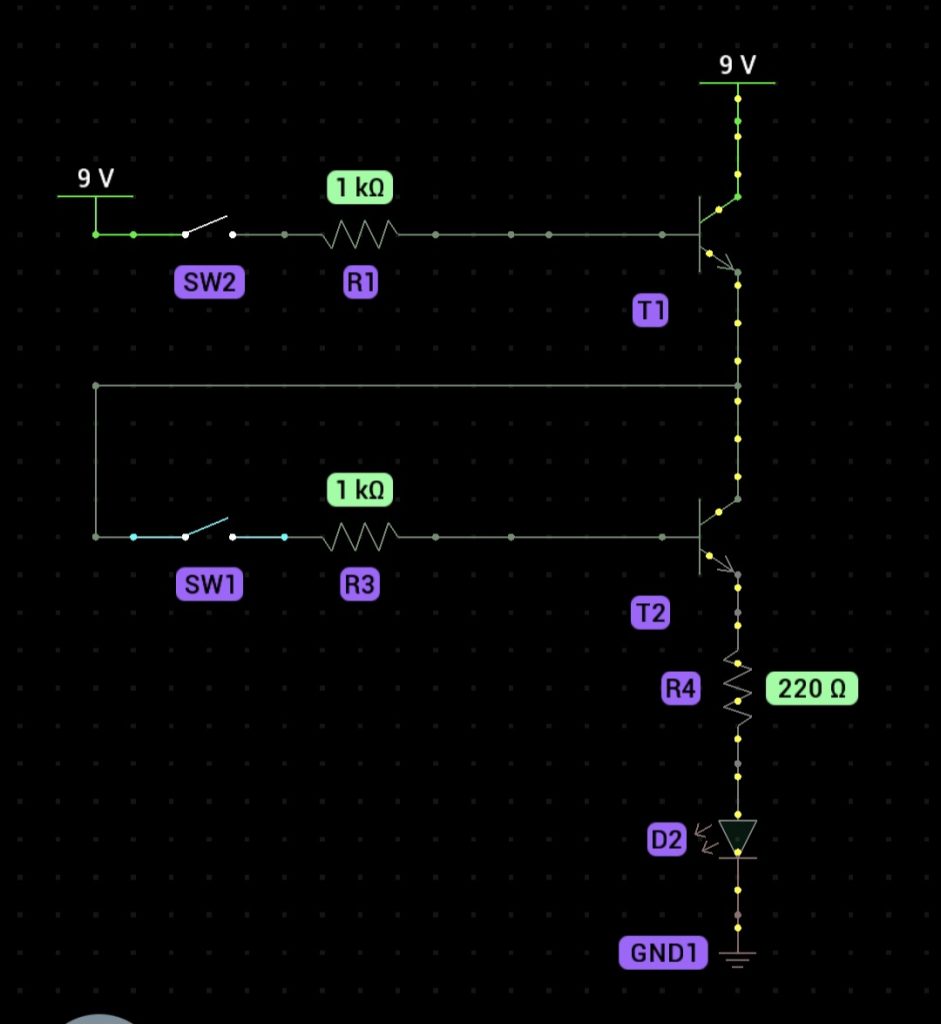In this circuit, the transistors act as switches. The LED will light up only when both push-button switches are pressed, which provides current to the bases of both transistors. This allows current to flow from the first transistor’s collector to its emitter, through the second transistor, and then to the LED. If either switch is not pressed, the circuit is incomplete, and the LED remains off. The resistors protect the LED and transistors by limiting the current flow.