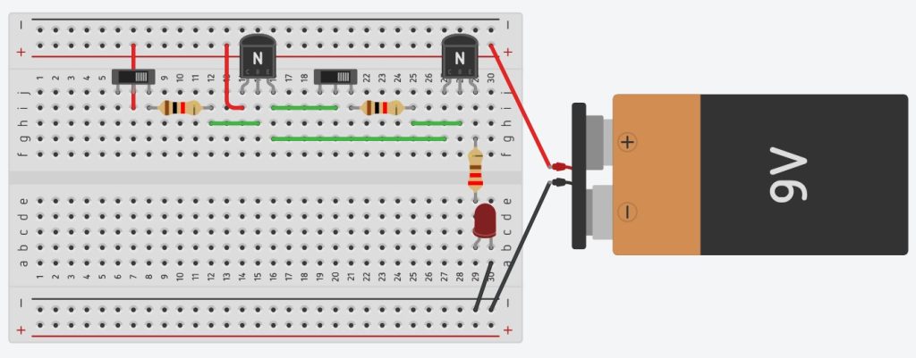 - Verify all connections, then test the circuit by pressing both switches simultaneously to light up the LED.